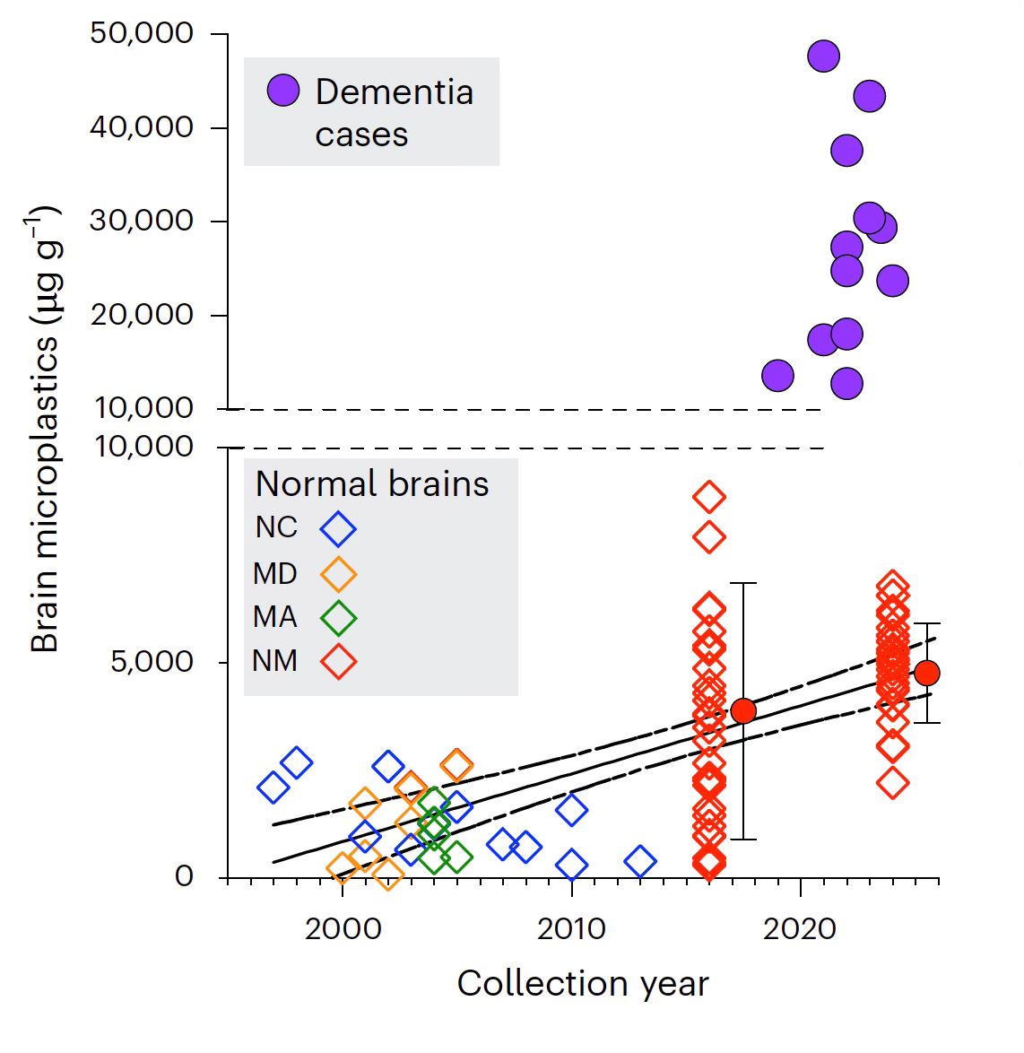 - People struggling with dementia showed 2 to 10 times higher microplastic levels in their brains compared to those without the condition